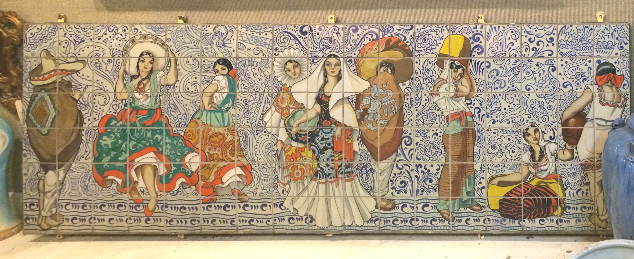 This mural came from a famous mansion in California.  Sadly, a very wealthy sports celebrity purchased the spectacular Spanish Revival 1920s mansion and against all the historical preservationists demands tore it down in the middle of the night. There were California tiles everywhere, and other tile murals in the outside walls. Tons of frescoes, wrought iron etc. The mansion was overlooking the Riviera Country Club and golf course, very near Diane Keaton’s house, just off Sunset Boulevard. It was one of the Carnation heir's mansions. Made in California by a Mexican tile maker in the Chilean style.