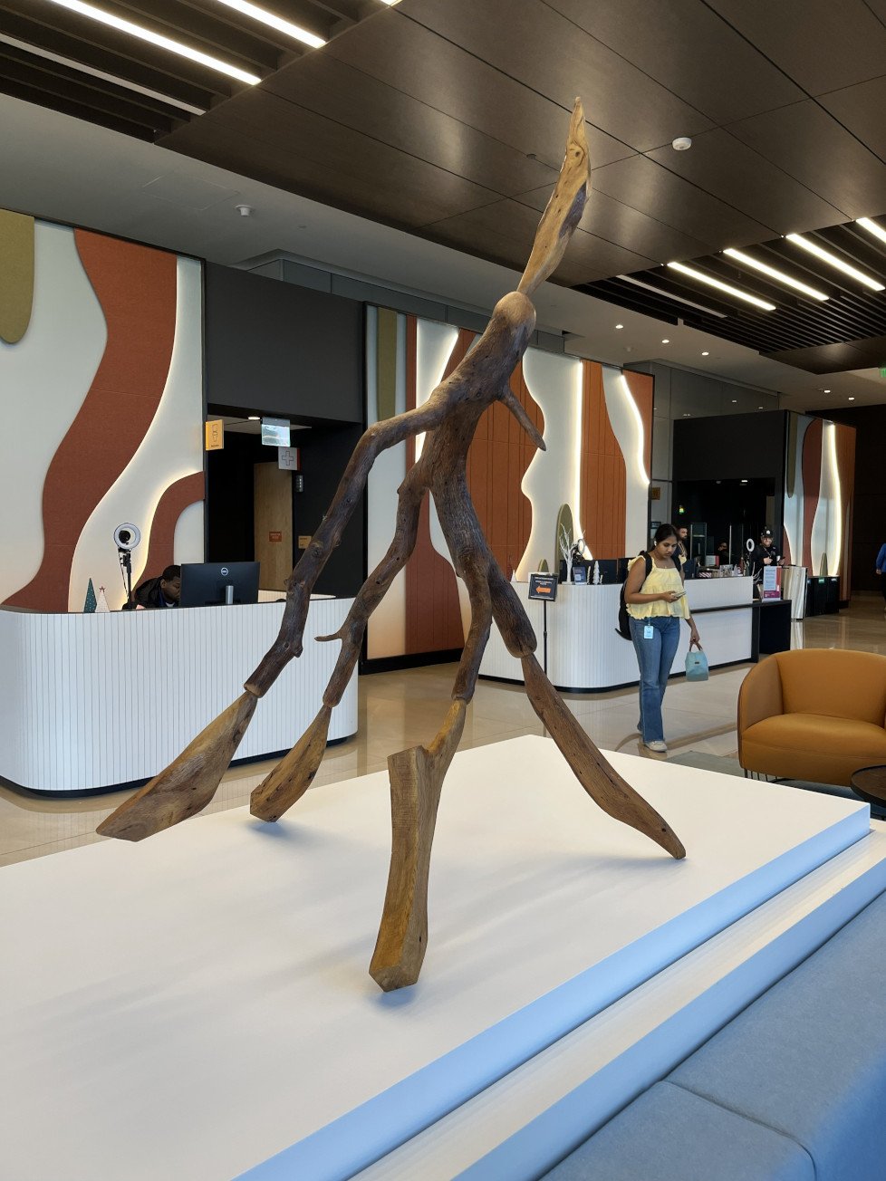 He carves, whittles and stains his objects, but creating a monotone effect, rarely paints them but sometimes burns images into them. Some of his works are large, as much as nine-feet tall.