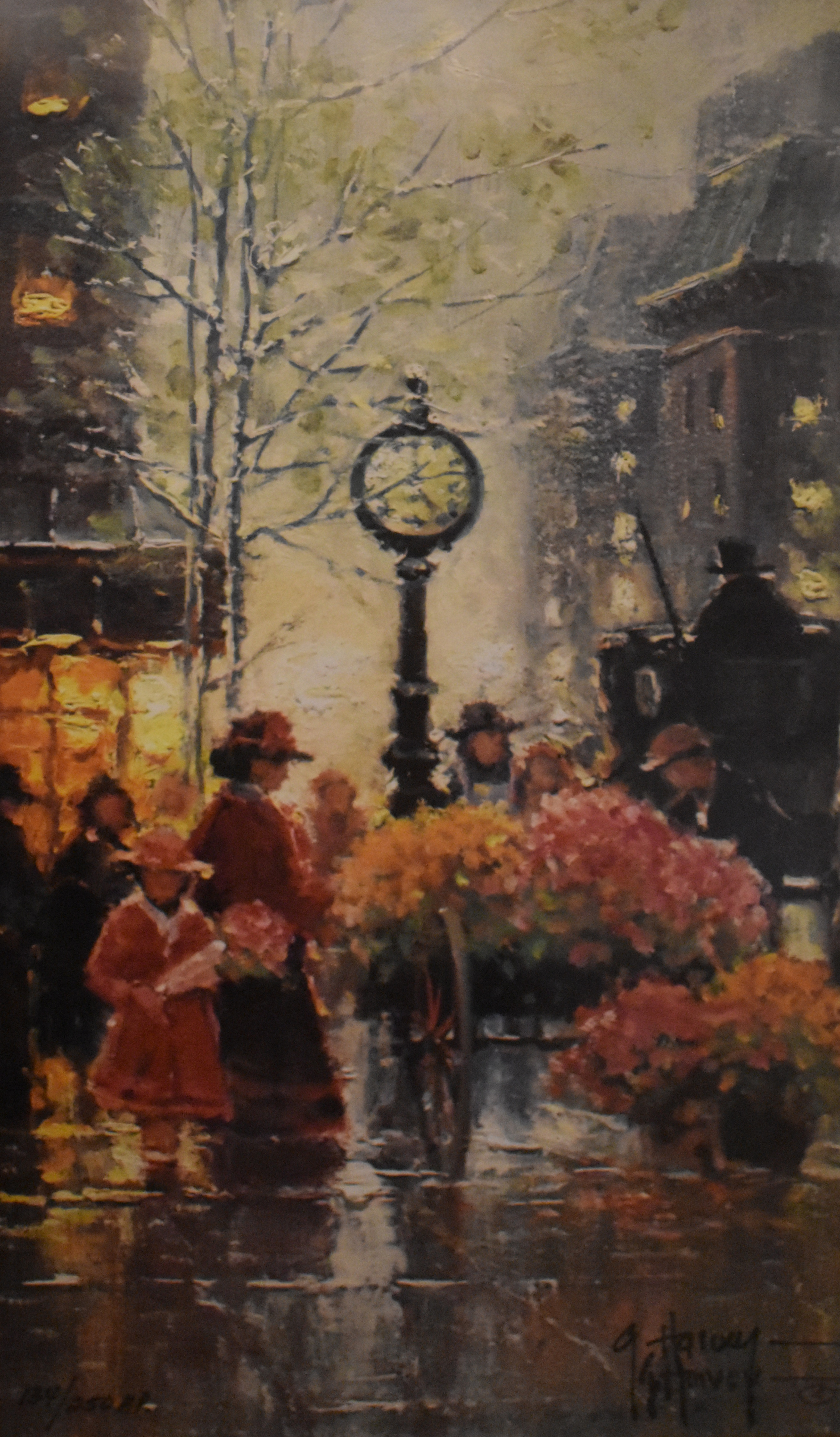 Known for paintings closely linked in mood and subject matter to Edouard Cortes [1882-1962], G Harvey creates romanticized street scenes of turn of the century towns in America. Rain slick streets reflect urban lights, and the weather is obviously cold. He grew up in the rugged hills north of San Antonio, Texas from where herds of longhorn cattle were once driven up dusty trails to the Kansas railheads. His grandfather was a trail boss at 18 and helped create an American legend for his grandson. So the American West is not only the artist's inspiration but his birthright.