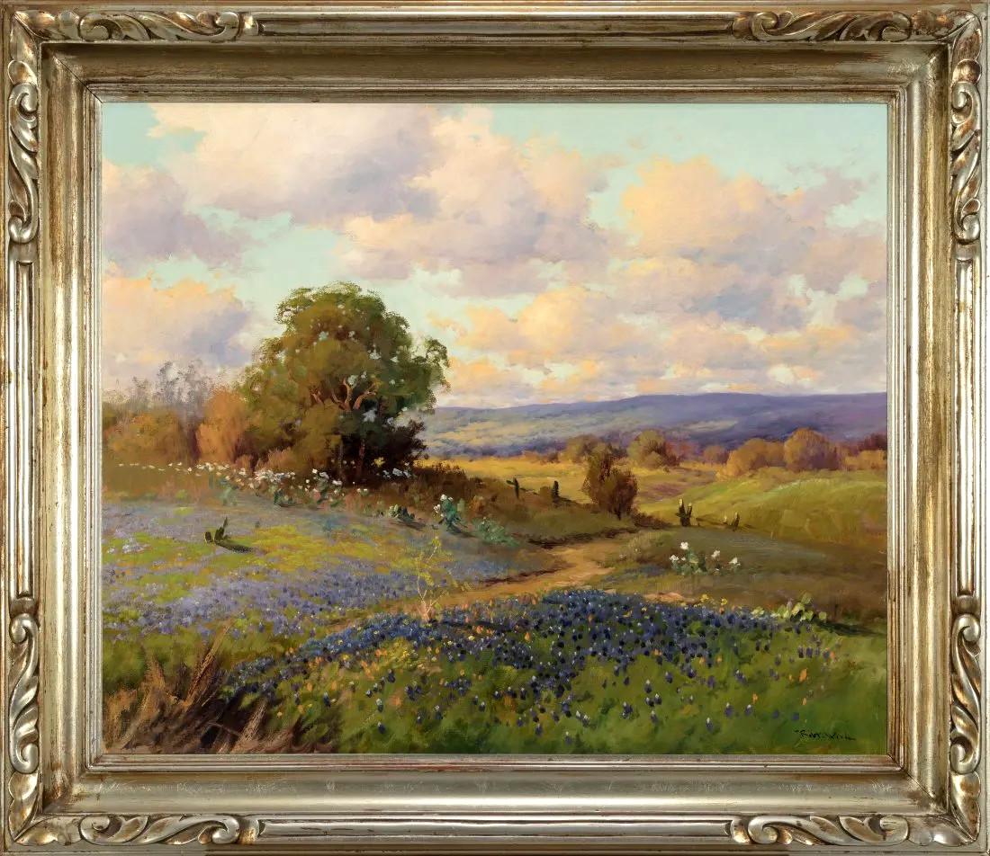 A painter of realistic landscapes reflecting a vanishing wilderness in America, Robert Wood (not to be confused with Robert E. Wood) is reportedly one of the most mass-produced artists in the United States. His painting became so popular he was unable to meet all of the demands, and many of his works were reproduced in lithographs and mass distributed as prints, place mats, and wall murals by companies including Sears, Roebuck. He was born in Sandgate, Kent on the south coast of England near Dover, the son of W.L. Wood, a famous home and church painter who recognized and supported his son's talent. In fact, he forced his son to paint by keeping him inside to paint rather than playing with his friends. At age 12, Wood entered the South Kensington School of Art. As a youth, he came to the United States in 1910, having served in the Royal Army, and he never returned to England. He traveled extensively all over the United States, especially in the West, often in freight cars, and also painted in Mexico and Canada. His itinerant existence took him to Illinois where he worked as a farmhand, to Pensacola, Florida where he married, briefly in Ohio, Seattle, Washington, and Portland, Oregon. In 1912, he was in Los Angeles, and In the late 1920s and early 1930s, in San Antonio, Texas, where he lived and in 1928 exhibited in the "Texas Wildflower Competition." From San Antonio, he gained a national reputation for his strong colored, dramatic paintings. Some of that prestige has been credited to his association with Jose Arpa, prominent Texas artist. Wood also gave art lessons, and one of his students was Porfirio Salinas. During this period, Wood sometimes signed his paintings G. Day or Trebor, which is Robert spelled backwards. In 1941 he went to California and painted numerous desert and mountain landscapes and coastal scenes. He lived in Carmel for seven years, and then moved to Woodstock, New York, but he soon returned to California, settling first in Laguna Beach, then San Diego, and finally in the High Sierras, where he and his wife built a home and studio near Bishop and lived until his death in 1979. Robert Wood was born March 4, 1889, in Sandgate, England, a small town on the Kentish coast not far from the white cliffs of Dover. His father, W. J. Wood was a successful painter who recognized Robert's unusual talent. At the age of twelve, his father enrolled Wood in art school in the small town of Folkestone. He then attended the South Kensington School of Art. While attending art school, Wood won four first awards and three second awards, one each year, a record. In 1910 after service in the Royal Army, nineteen-year-old Wood and his friend, Claude Waters, immigrated to America. Initially, he settled in Illinois and worked as a hired hand on a farm belonging to Water's uncle. He would then strike out on his own, living the life of an itinerant painter. Wood traveled as a hobo, hopping freight trains and selling or bartering small paintings to support him along the way. When times were hard, he worked at whatever job was available. In this manner, he saw most of the United States and fell in love with rural America. By 1912, Wood visited Los Angeles for the first time, arriving on the day of the Titanic tragedy. Later that year, he had met, courted and married young Eyssel Del Wagoner in Florida. The couple moved to Ohio where a daughter, Florence, was born. During World War I, the family moved to Seattle where a son, John Robert Wood, was born in 1919. In the early 1920's, the young Wood family was almost constantly on the move. They stayed for short periods in Kansas, Missouri, California and for a longer time in Portland, Oregon, where Wood's friend Claude Waters had settled. Wood's seemingly endless wanderings disrupted his family life and delayed his development as a painter. However, through his travels he developed an appreciation for the American landscape that would inspire him for the rest of his career. Although aware of the current movement away from traditional realism in American art, he elected to travel that solitary path and remain true to his own vision of America's grandeur and beauty poetically translated through his landscape and seascape paintings. In 1923, the Wood family discovered the beautiful city of San Antonio, Texas and it was there that he and his family would finally settle. He studied briefly at the San Antonio Art School with Spanish colorist Jose Arpa y Perea (1860-1952), who had arrived in San Antonio that same year. In the latter part of the 1920’s, Jose Arpa’s influence quickly became evident. Wood after several years of experimentation was becoming a fine easel painter, capable of great subtlety with a new mature original style. Like Texas painters Robert Onderdonk (1853-1917) and his son Julian Onderdonk (1882-1922), Robert Wood concentrated on the distinctive Texas landscape with its Red Oak trees and wildflowers that covered the hill country landscape. He developed a reputation for his scenes of Blue Bluebonnets, the state flower. In the spring, the Texas prairie is covered with wildflowers, especially in the hill country surrounding San Antonio and Austin. Wood incorporated native stone barns and rough wood farmhouses that added authenticity and romance to his compositions. In 1925, Wood was divorced from his wife. In 1932, he moved to the famous scenic loop on San Antonio's outskirts. While still living in Texas, he took extensive western sketching trips that brought him to California. It is evident that his 1930’s California and Texas works started to show his awareness of the then popular California Plein-Air movement. These more mature works are distinguished by a fine sense of detail reminiscent of late-19th-century American landscape painters laced with the colorful influence of American and French impressionism. With paintings being shipped to dealers across the continent, Wood’s reputation with collectors was growing nationally. It s