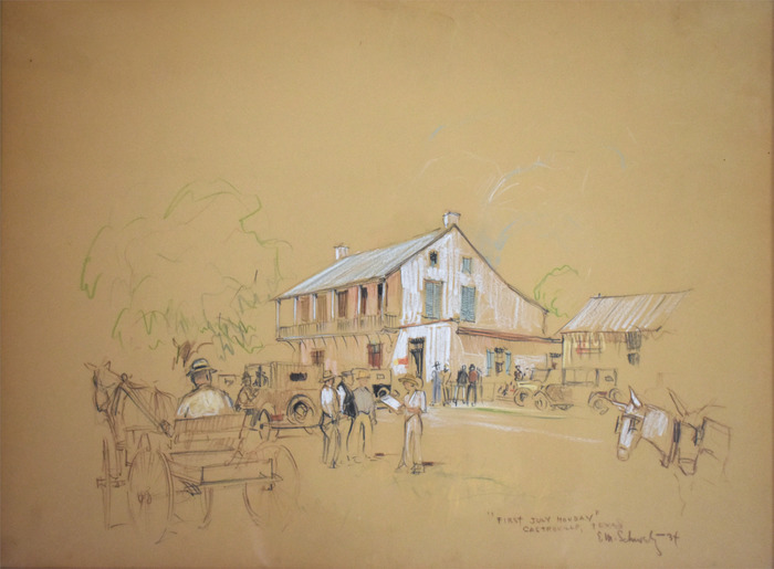 Edward Muegge Schiwetz was a painter whose work recorded the state of Texas from the country to the city. In addition, Schiwetz was a magazine illustrator, graphic artist, writer, preservationist, and architect.Edward Schiwetz was born and raised in Cuero, Texas and learned to draw and paint under the instruction of his mother. He graduated from Cuero High School (1916) and received a baccalaureate in architecture from Texas A & M college, College Station, Texas (1921). In1928, Schiwetz moved to New York City where he studied lithography and etching at the Art Students League. During this time he successfully marketed his work to publications including Scribner's, House Beautiful and the Architectural Record. Schiwetz returned to Texas in 1929 and became an art director and partner in the successful Houston advertising agency of Franke, Wilkinson, and Schiwetz. After retiring from the advertising agency in 1966, he devoted himself almost entirely to painting and drawing. In 1974, he moved to College Station where he worked on campus scenes at his alma mater.The Houston Art League honored Schiwetz in a festive tribute the year before his death and named him Texas Artist of the Year.He died in Cuero, Texas in 1984.Schiwetz was a member of the Associated Artists of Houston; California Water Color Society; Contemporary Arts Association; Southern States Art League; Texas Society of Architects; Texas Fine Arts Association* and the Texas Watercolor Society.Exhibitions included American Watercolor Society; Philadelphia Watercolor Society; Art Institute of Chicago; Southern States Art League Annual Exhibition; Texas Painting and Sculpture Annual Exhibition; Western Watercolor Exhibition, San Francisco and the Pennsylvania Academy of the Fine Arts, Philadelphia.