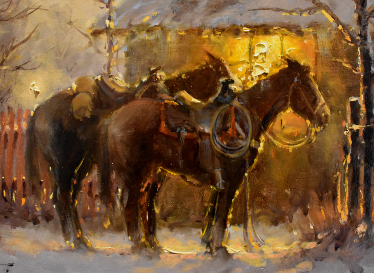 Harvey has always believed that history lives through art including the epic struggle between the states, the western migration, the brief time when horses and automobiles clattered across cobblestones together. He is faithfully able to capture the drama and feeling of such a moment in time. His light from windows, etc was inspired by artist Edouard Cortes' technique.​