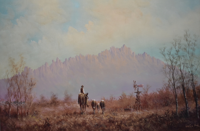 From El Paso, Texas, Lester Hughes was a self-taught artist who painted imaginative landscapes of the Southwest, often with horse-back riding cowboys intent on their duties. President Ronald Reagan purchased over a dozen paintings by Hughes, and some of them hung in the White House during Reagan's tenure.