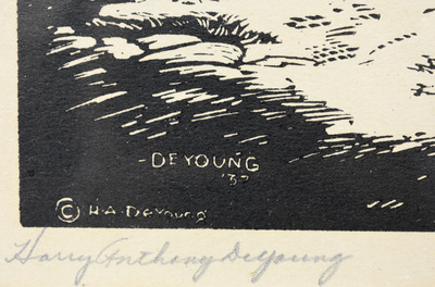 Harry Anthony DeYoung was born in Chicago, Illinois, on August 5, 1893. He was a landscape, figure, genre, and portrait painter, muralist, draftsman and teacher. He studied with Edward John Lake and John W. Norton at the University of Illinois, Urbana, and taught art classes for children in Chicago from 1914-1916. He was an honor student in 1917 at the Art Institute of Chicago, where he studied with F. de Forrest Schook and John Warner Norton. DeYoung served as a sergeant in the quartermaster corps during the last two years of World War I, 1917-1918. Back in Chicago following the War, he was active in teaching, as well as painting. In 1922, he was an assistant instructor at Bailey's Harbor Summer School of Art, Michigan; in 1923-1924, director of the Glenwood School of Landscape Painting, Illinois; director of the Midwest Summer School of Art, Paw Paw, Michigan, in 1924-1929; and instructor at the National Academy of Art, Chicago, 1927-1928. After coming to San Antonio for the Edgar B. Davis Art Competition, DeYoung founded the DeYoung Art School there in 1928. Over the years before settling in Texas, he conducted a summer painting camp at Fort Davis and plein-air classes in Texas at Port Isabel, Eagle Pass, Abilene, Brownwood, and Boerne, as well as in New Mexico, and Monterrey, Mexico. At Sul Ross State Teachers College, Alpine, he became director of the Summer School of Art in 1940. DeYoung taught summer classes in Brownwood and tri-monthly classes in Brownsville. His murals include those at the St. Anthony Hotel, San Antonio, that were subsequently destroyed; and depictions of basket-maker Indians in West Texas, at the Witte Memorial Museum, San Antonio. After a paralyzing stroke in 1942 resulted in his hospitalization in Waco, the artist learned to paint with his left hand, continuing his career in art for another fourteen years before his death in 1956 in Waco. Harry DeYoung died on January 9, 1956, and is buried in Fort Sam Houston National Cemetery, San Antonio. Some of the artist's awards include the Fine Arts Building Purchase Prize of $500 at the Art Institute of Chicago, in 1925; and honorable mention in landscape painting at the American Artists Exhibition of Chicago. In 1927 he received honorable mention at the Chicago Galleries Association. In the Edgar B. Davis Competitive Exhibition in San Antonio in 1928 he won the member prize of $200. DeYoung was a member of the All-Illinois Society of Artists; Chicago Galleries Association; Chicago Painters and Sculptors Association; San Antonio Art League; Society of Texas Artists; Texas Federated Art Association; Texas Fine Arts Association; and Villita Street Gallery, San Antonio. DeYoung's portraits of notables including Davey Crockett are in the collection of The Alamo in San Antonio. Other San Antonio collections holding his paintings are the Witte Museum; Marion Koogler McNay Art Museum; Brackenridge High School; the St. Anthony Hotel; and San Antonio Art League (his painting, "Cinchin' Up". De Young's work is also found at the Historical House Museum, Boerne; Brownsville Art League Museum; Fort Davis High School; Torch Energy Advisors, Inc., Houston; Moore Collection, Los Angeles, California; Harold Swift Collection and Fenger High School, Chicago; Gary High School, Indiana; Hammond High School, Indiana; Susan B. Allen Memorial Hospital, El Dorado, Kansas; and Lincoln High School, Milwaukee, Wisconsin. Harold DeYoung's exhibitions include: Art Institute of Chicago, American Artists Exhibition, and the Art Institute of Chicago.