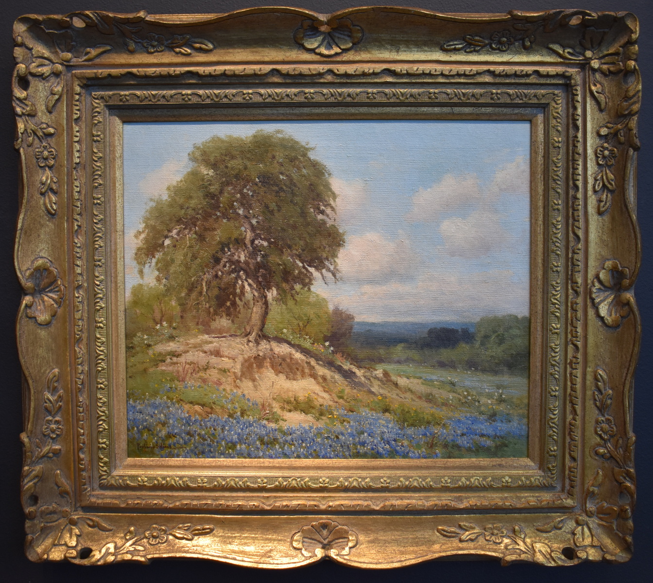 Porfirio Salinas was a self-taught artist who painted landscapes of Central Texas with an emphasis on the vast bluebonnet fields that grow there in the springtime. Born in 1910 in Bastrop, Texas, he attended public schools in San Antonio. He also observed works in progress by the director of the San Antonio Art School, Jose Arpa, as well as landscape painter, Robert Wood. Wood is said to have paid Salinas five dollars a picture to paint bluebonnets because "he hated to paint bluebonnets".  Salinas served in the military from 1943 to 1945.  Although he was assigned to Fort Sam Houston, he was allowed to live at home. At the fort, Colonel Telesphor Gottchalk assigned him to paint murals for the officer's lounge and various other projects, and Salinas continued to be able to paint during his entire conscripted period.  Even before he achieved notoriety among galleries, dealers, and museums, Salinas was widely followed and appreciated by many Texans, including former President Lyndon B. Johnson, who may be considered responsible for launching Salinas popularity beyond the boundaries of Texas. In 1973, Texas capital, Austin, honored Salinas for having "done much to bring the culture of Mexico and Texas closer together with his paintings".  Salinas died in April 1973 in San Antonio, Texas.