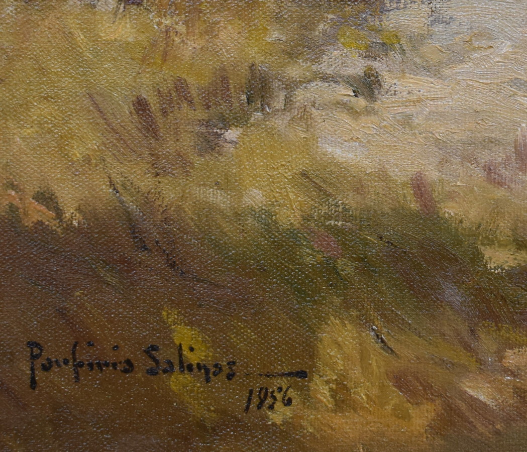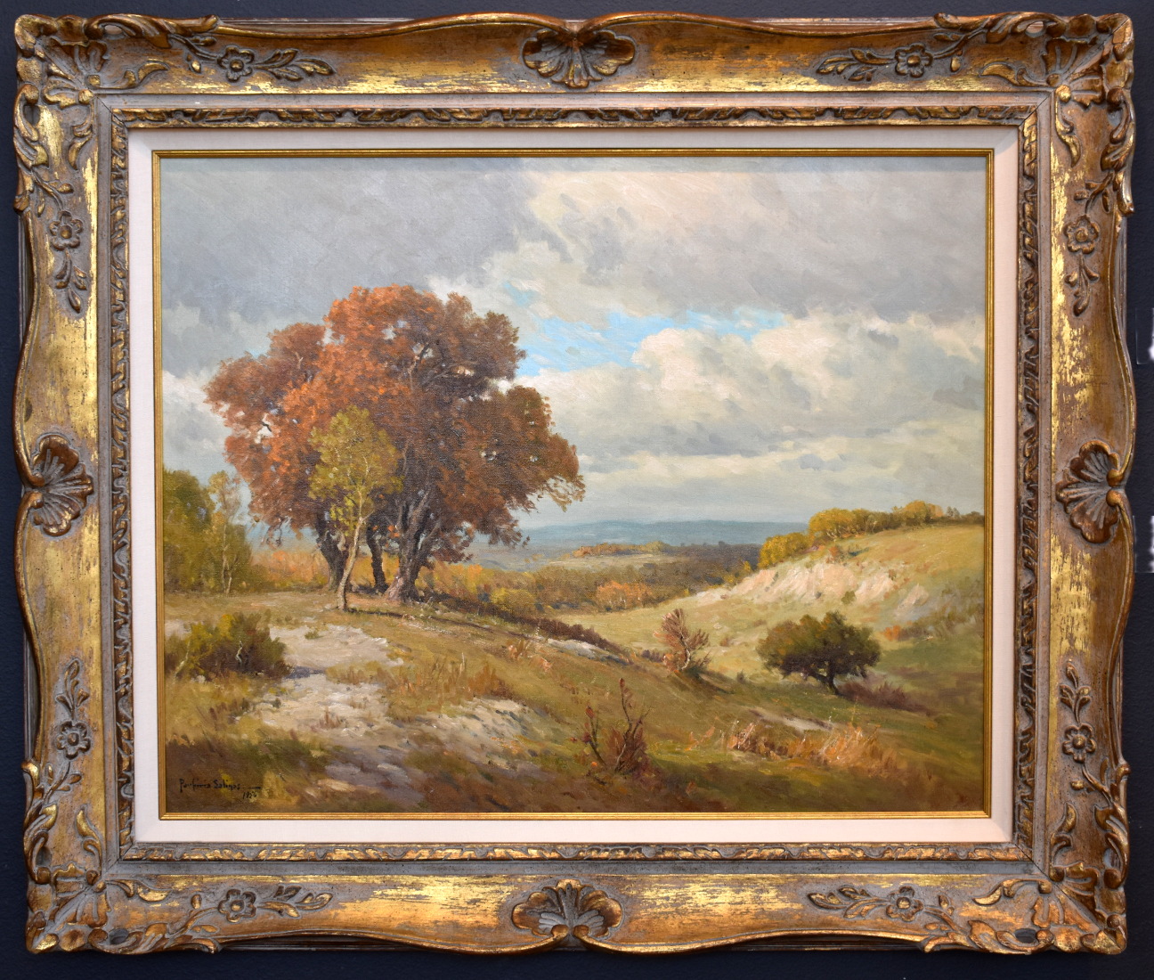 Porfirio Salinas was a self-taught artist who painted landscapes of Central Texas with an emphasis on the vast bluebonnet fields that grow there in the springtime. Born in 1910 in Bastrop, Texas, he attended public schools in San Antonio. He also observed works in progress by the director of the San Antonio Art School, Jose Arpa, as well as landscape painter, Robert Wood. Wood is said to have paid Salinas five dollars a picture to paint bluebonnets because "he hated to paint bluebonnets".  Salinas served in the military from 1943 to 1945.  Although he was assigned to Fort Sam Houston, he was allowed to live at home. At the fort, Colonel Telesphor Gottchalk assigned him to paint murals for the officer's lounge and various other projects, and Salinas continued to be able to paint during his entire conscripted period.  Even before he achieved notoriety among galleries, dealers, and museums, Salinas was widely followed and appreciated by many Texans, including former President Lyndon B. Johnson, who may be considered responsible for launching Salinas popularity beyond the boundaries of Texas. In 1973, Texas capital, Austin, honored Salinas for having "done much to bring the culture of Mexico and Texas closer together with his paintings".  Salinas died in April 1973 in San Antonio, Texas.