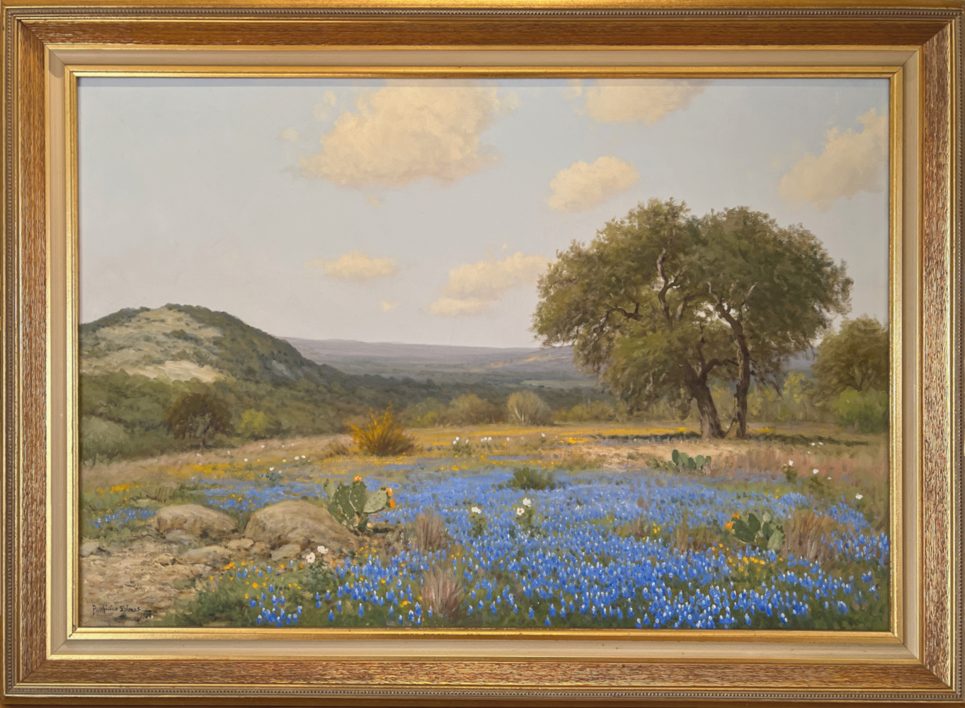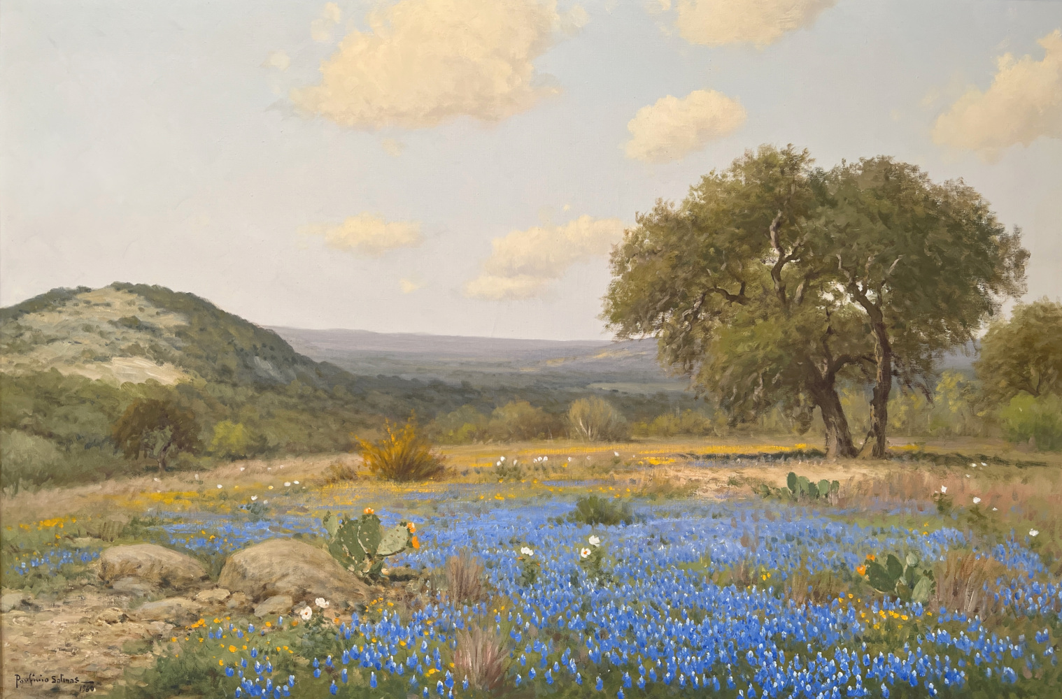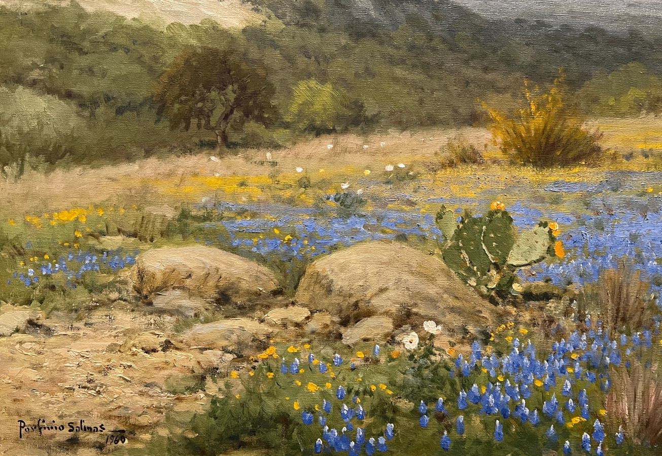 Porfirio Salinas was a self-taught artist who painted landscapes of Central Texas with an emphasis on the vast bluebonnet fields that grow there in the springtime. Born in 1910 in Bastrop, Texas, he attended public schools in San Antonio. He also observed works in progress by the director of the San Antonio Art School, Jose Arpa, as well as landscape painter, Robert Wood. Wood is said to have paid Salinas five dollars a picture to paint bluebonnets because "he hated to paint bluebonnets".  Salinas served in the military from 1943 to 1945.  Although he was assigned to Fort Sam Houston, he was allowed to live at home. At the fort, Colonel Telesphor Gottchalk assigned him to paint murals for the officer's lounge and various other projects, and Salinas continued to be able to paint during his entire conscripted period.  Even before he achieved notoriety among galleries, dealers, and museums, Salinas was widely followed and appreciated by many Texans, including former President Lyndon B. Johnson, who may be considered responsible for launching Salinas popularity beyond the boundaries of Texas. In 1973, Texas capital, Austin, honored Salinas for having "done much to bring the culture of Mexico and Texas closer together with his paintings".  Salinas died in April 1973 in San Antonio, Texas.